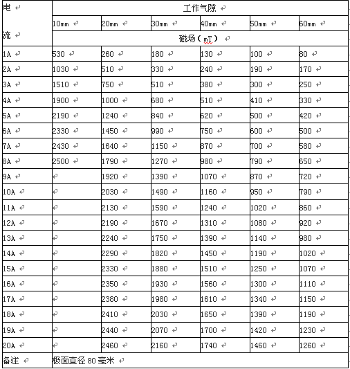 4.4 磁場強(qiáng)度:工作氣隙20mm時(shí),80mm極頭中心磁場最大H≥2.2T
